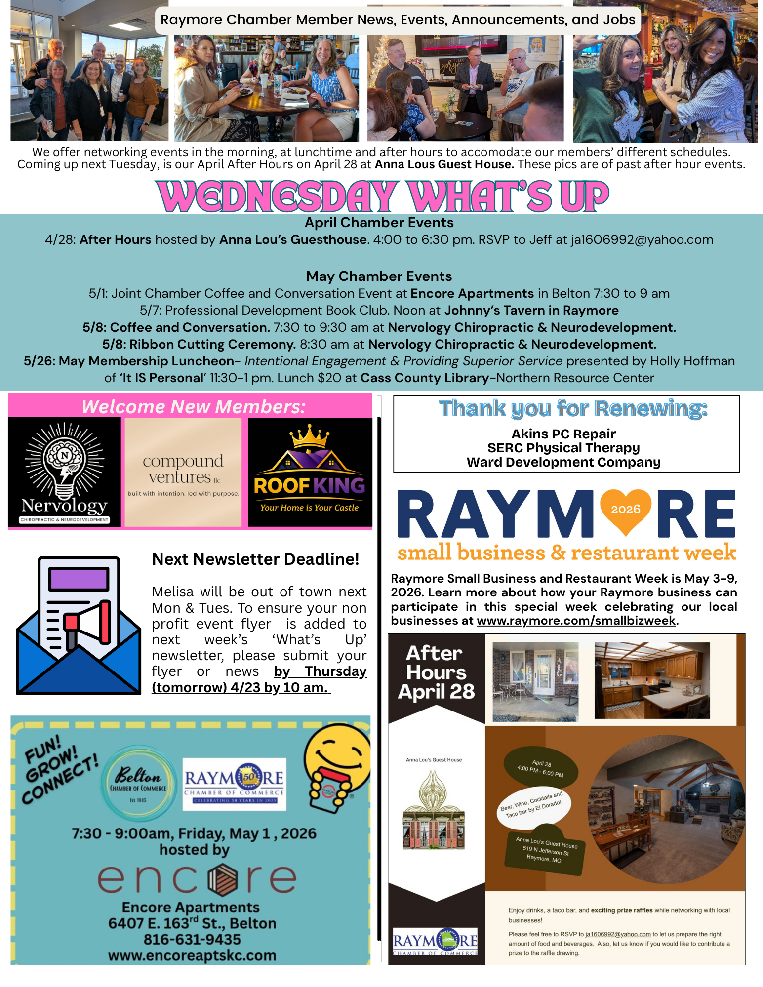 Click on the image for the complete Weekly Raymore Chamber Newsletter: April 22, 2026
